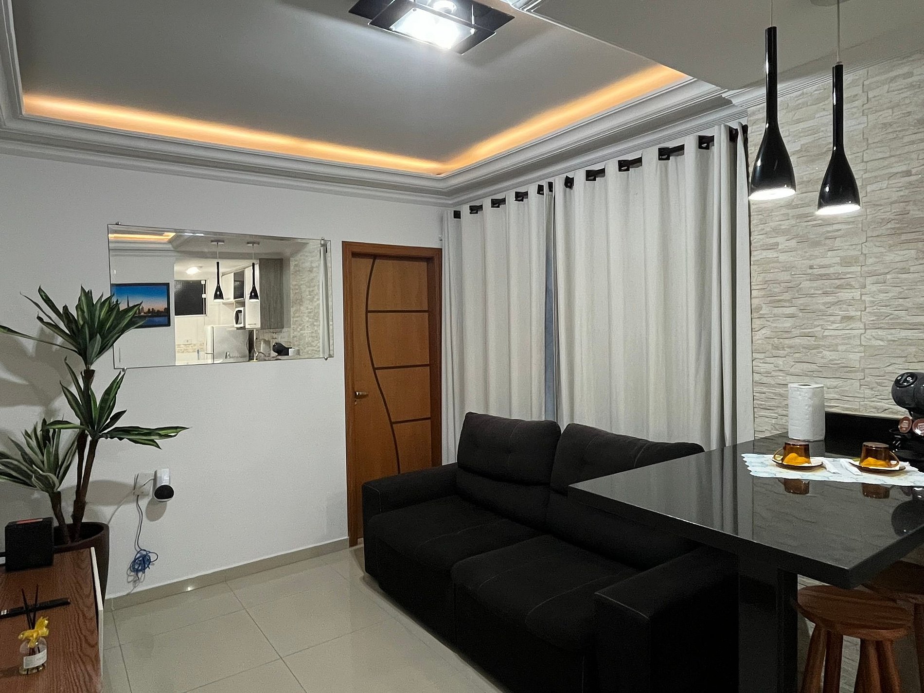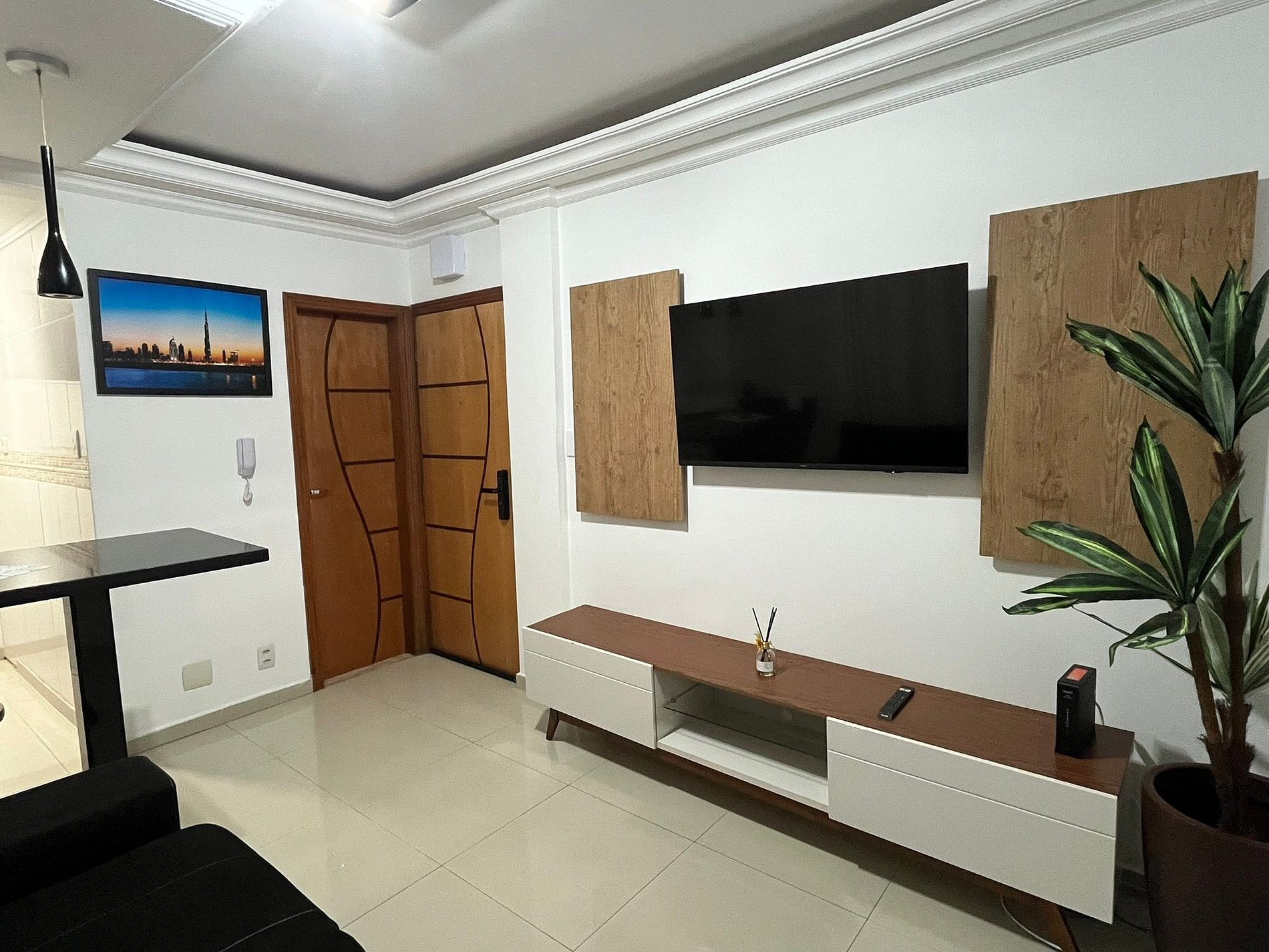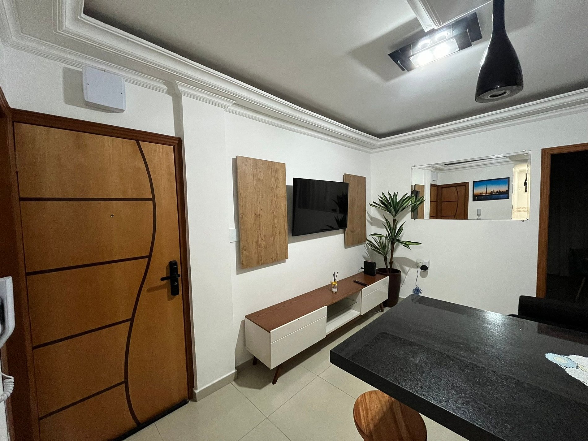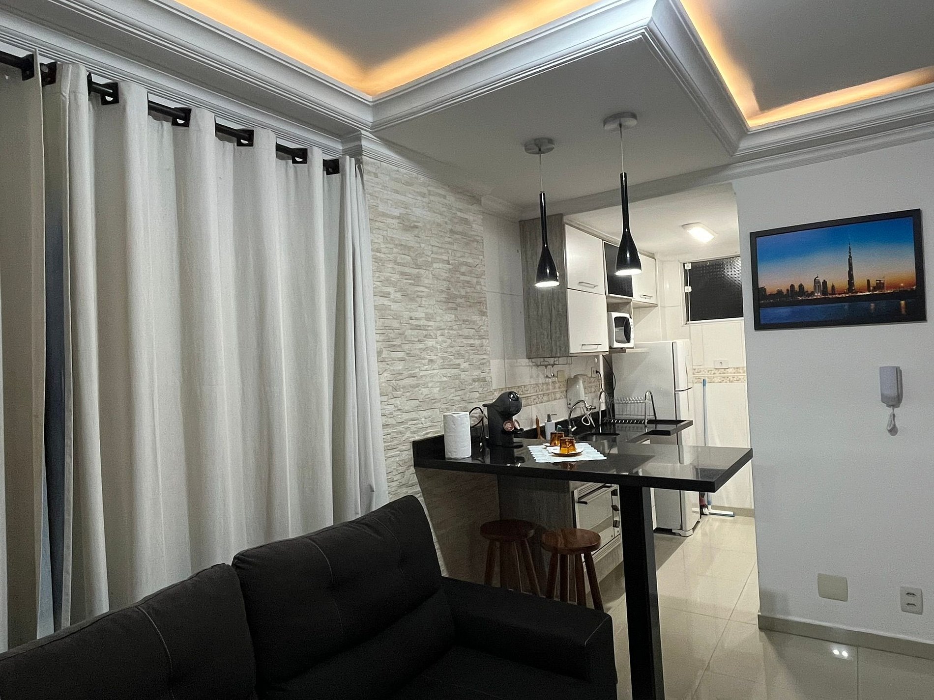 Apartamento com Sala, Quarto, Cozinha e Banheiro, totalmente equipado. Internet Wi-Fi, Geladeira, Micro-ondas, Fogão, Forno Elétrico, Ar Condicionado, Roupas de Cama e Banho, Utensílios de Cozinha (Pratos, Talheres, Panelas, etc), Cafeteira Dolce Gusto e...... A Melhor Vista Panorâmica de toda a Baixada Santista ! Cama de Casal, Guarda Roupas, TV Smart e a Melhor Experiência, com a melhor vista e a melhor localização de São Vicente.