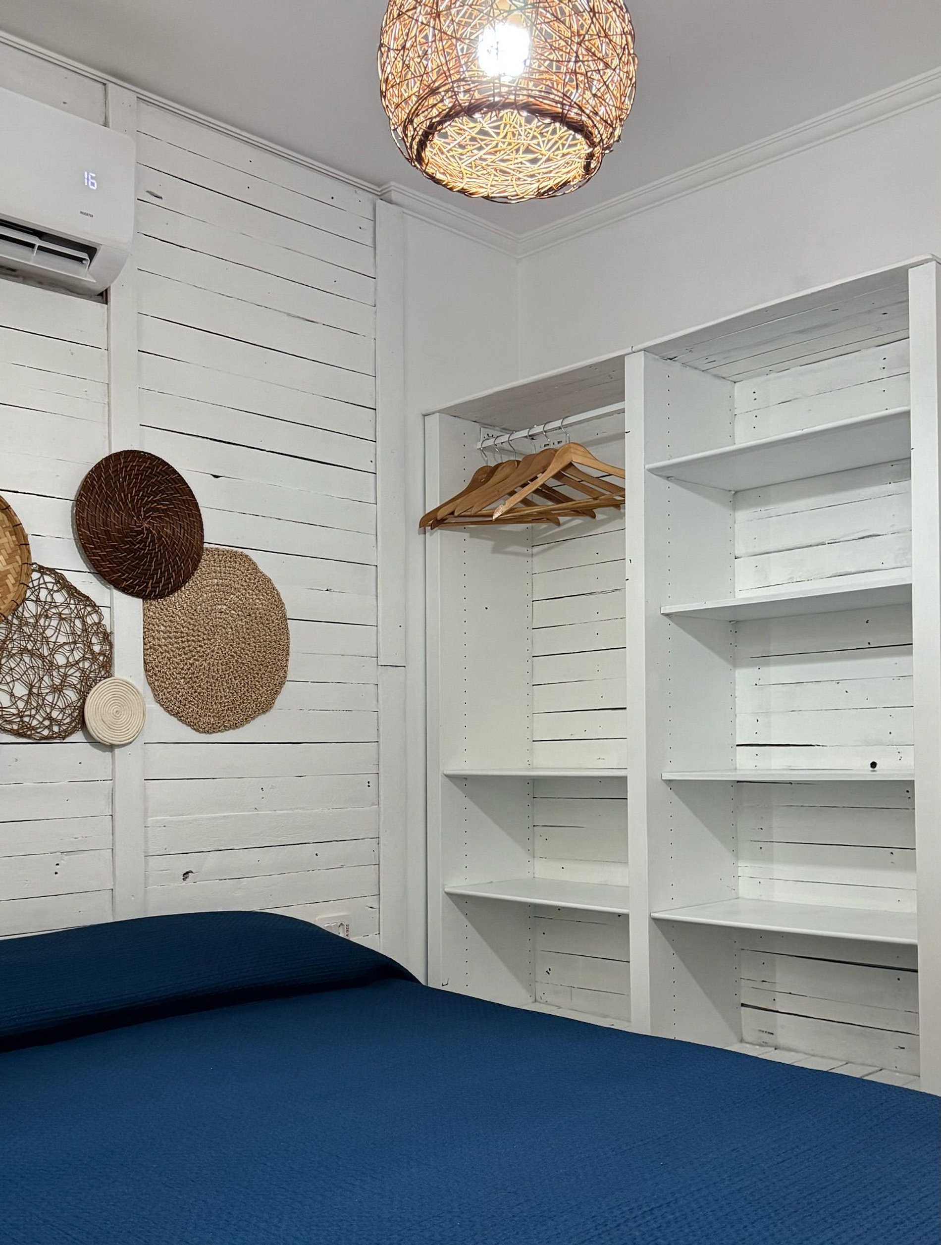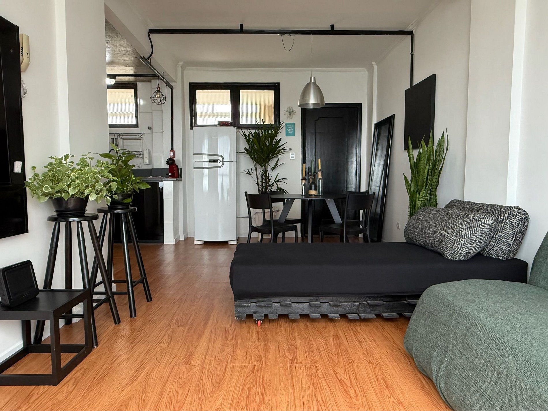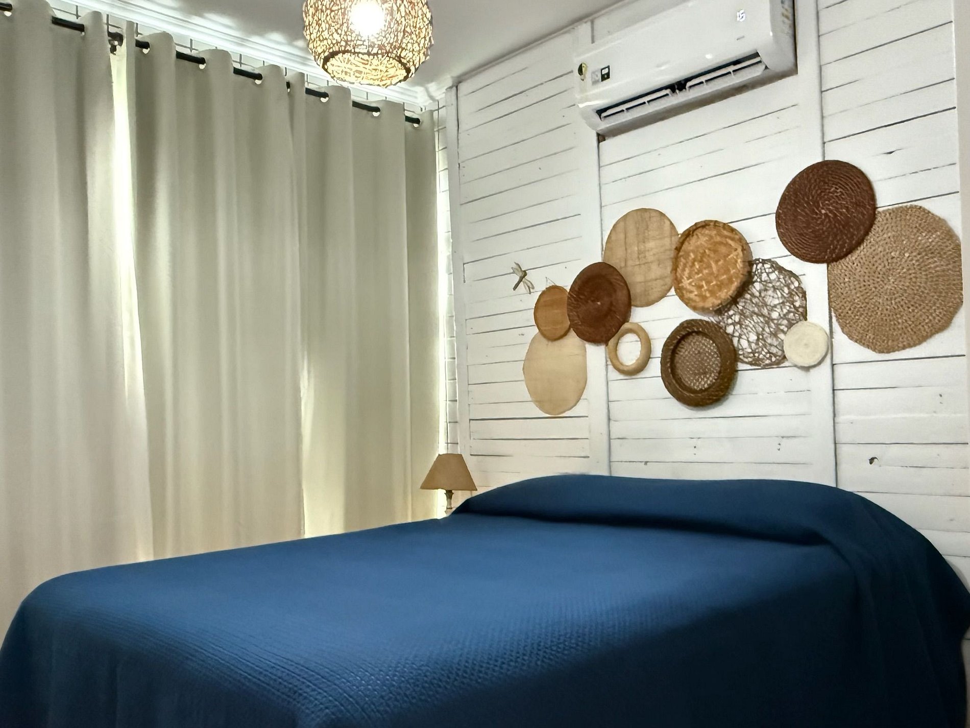 Quarto estilo rústico/industrial ensolarado e arejado, com vista para o mar. Aproveite a cama confortável e o escurinho que o blackout proporciona, se preferir dormir até tarde ou descansar após um dia na praia.